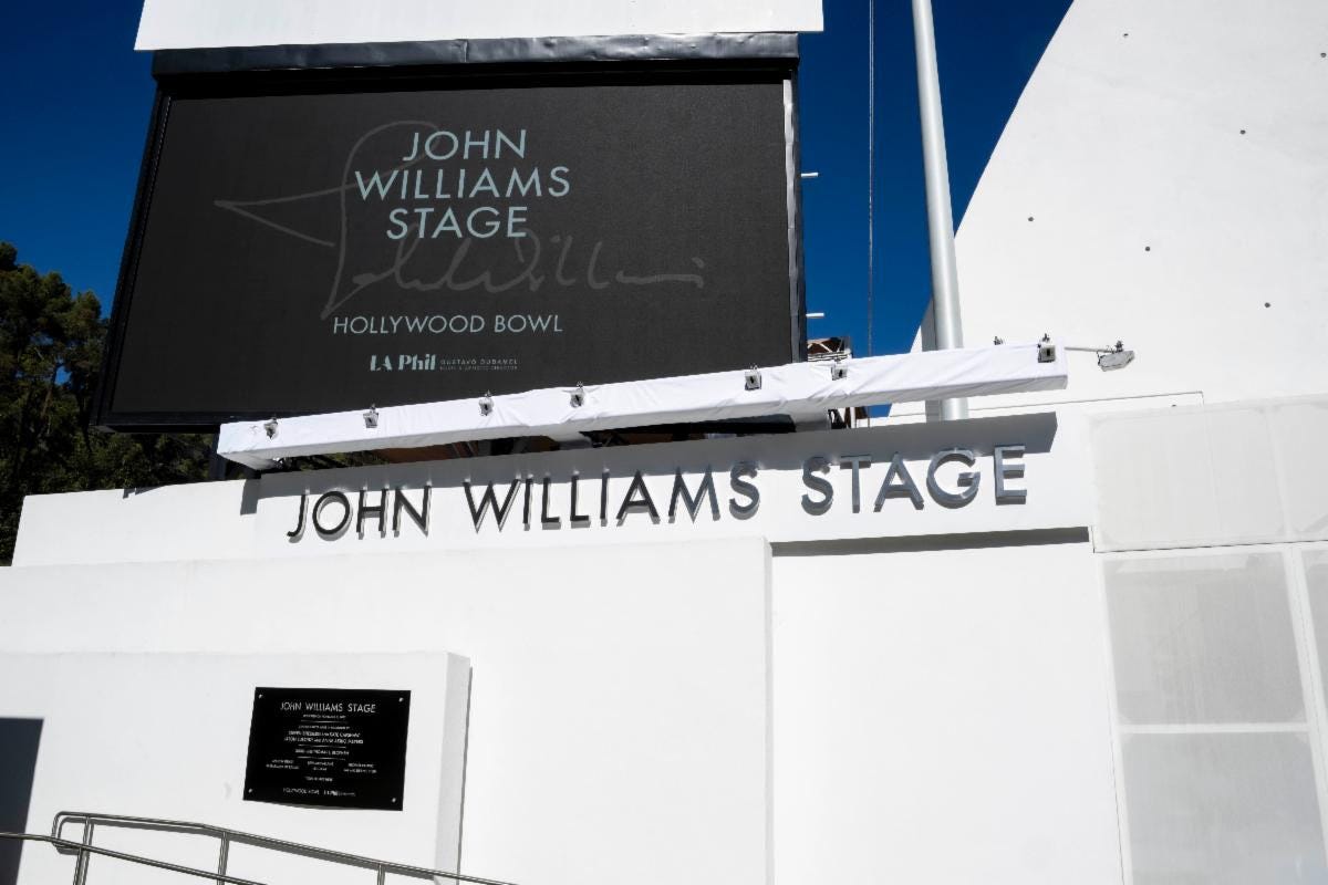 I wasn’t there; the LA Phil was instructed not to invite press. But I was very happy when I saw the news that, on Sunday, November 9, the iconic stage of the Hollywood Bowl was dedicated to John Williams in a private ceremony that featured such heavyweights as Steven Spielberg, George Lucas, Richard Dreyfuss, Gustavo Dudamel, Alan Silvestri, and friend of this Substack, David Newman!